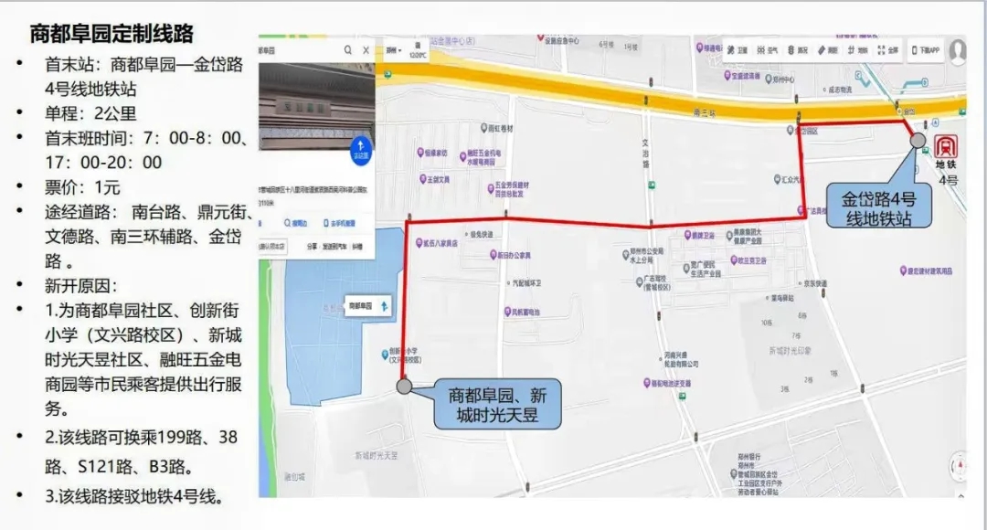 專線開通后,商都阜園項目租戶及業(yè)主實現(xiàn)了“出門即坐上公交,下車即地鐵口”的通勤效率新格局。線路途徑南臺路、鼎元街文德路、南三環(huán)輔路;中途包含超市、理發(fā)店、小商品城等便民商業(yè)點。無論是上班還是購物,都能享受到高效、舒適的出行體驗。線路單程2公里,除直達地鐵口外也可換乘199路、38路、S121路、B3路。不僅解決了租戶的通勤難題,也為周邊社區(qū)居民提供了便利,得到了大家的一致好評。