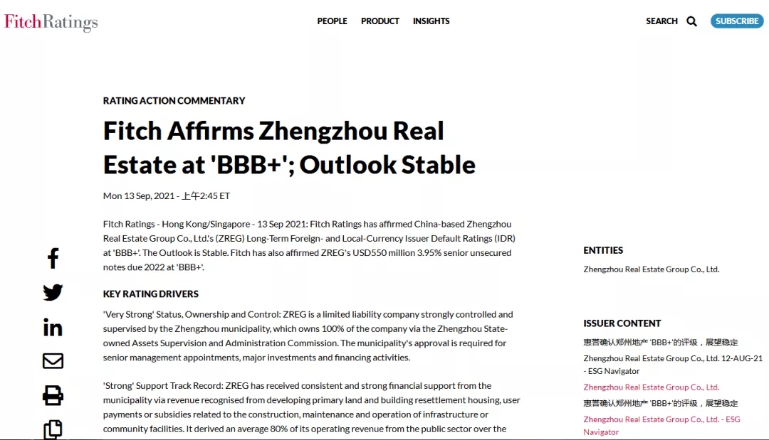 2021年9月13日,惠譽(yù)國際評(píng)級(jí)確認(rèn)鄭州地產(chǎn)集團(tuán)有限公司(簡(jiǎn)稱:鄭州地產(chǎn))發(fā)行人評(píng)級(jí)為“BBB+”,展望穩(wěn)定。